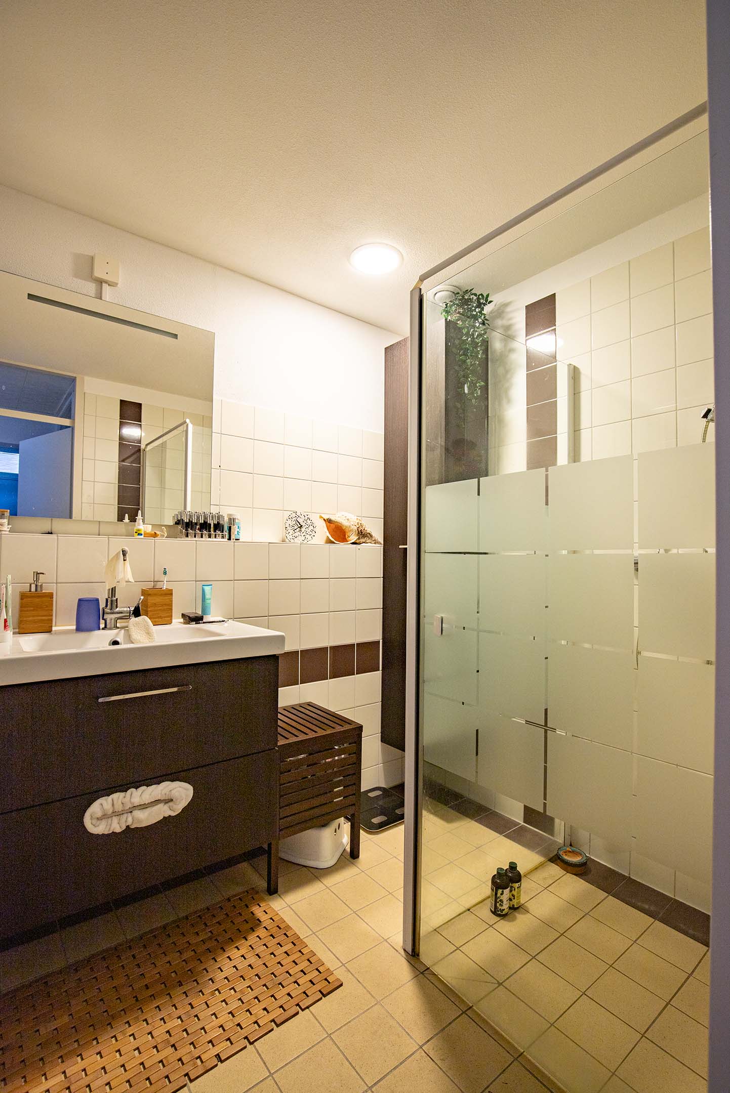 De badkamer is voorzien van een badmeubel met de wastafel en de douche met cabine. De vloer is betegeld; de wanden zijn deels betegeld waarboven spuitwerk is aangebracht; het plafond is eveneens afgewerkt met spuitwerk.