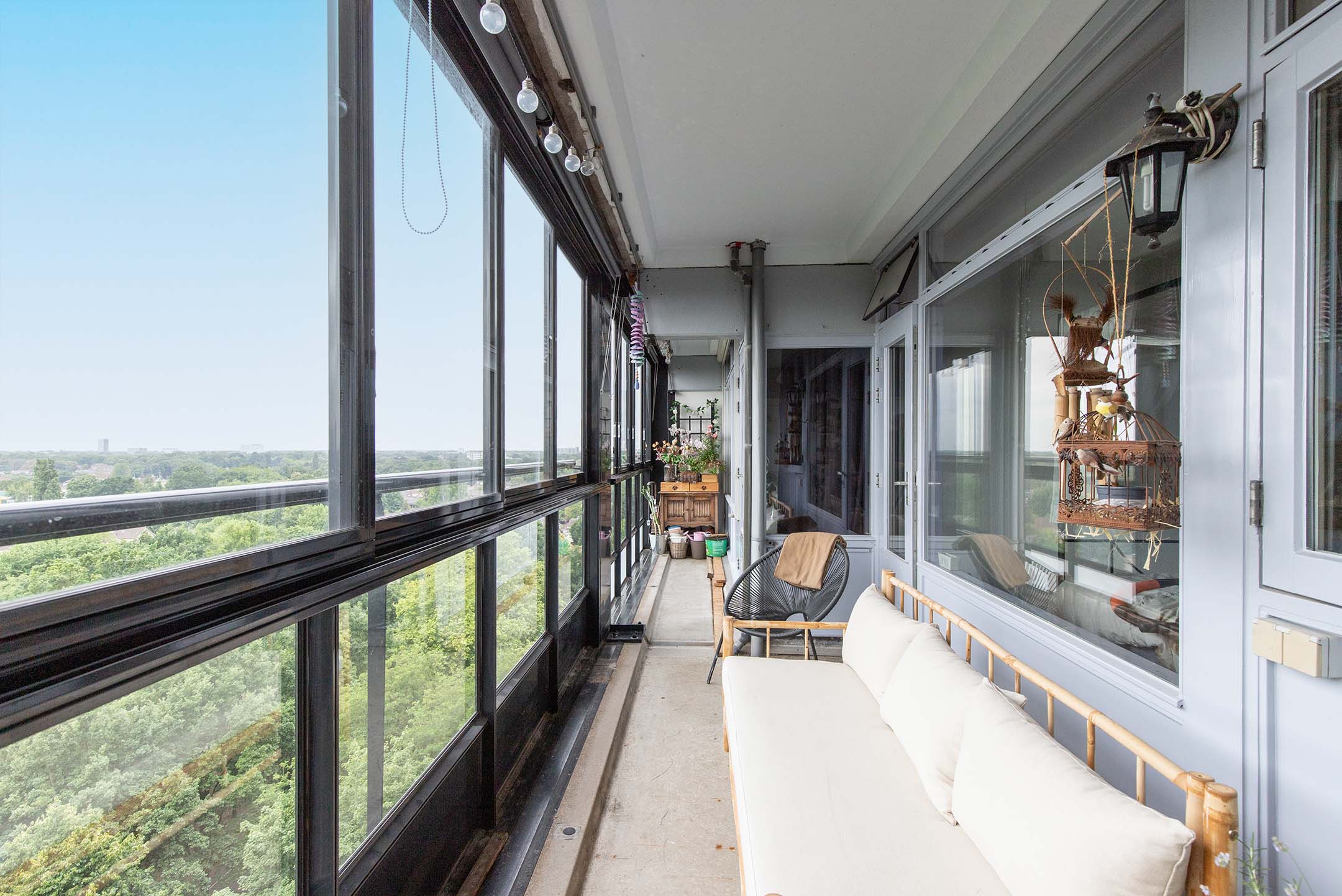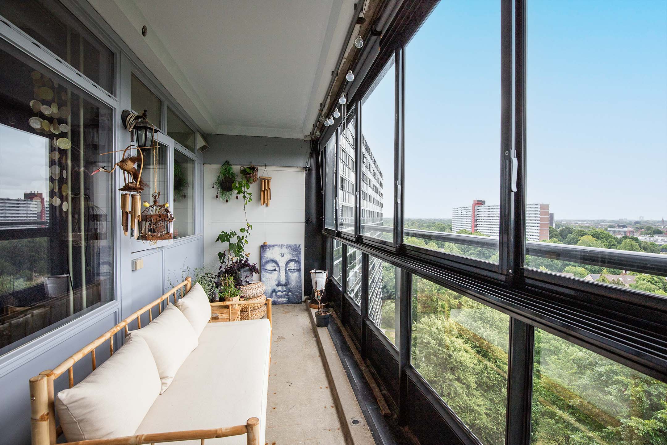 Het balkon is enkele jaren geleden voorzien van schuiframen zodat dit in feite een verlengde woonkamer is geworden. Zittend op het balkon heb je een fabelachtig en adembenemend uitzicht over de stad; je raakt er niet op uitgekeken. Hier zit je altijd goed, in de zomer of in de winter, overdag of ’s avonds.