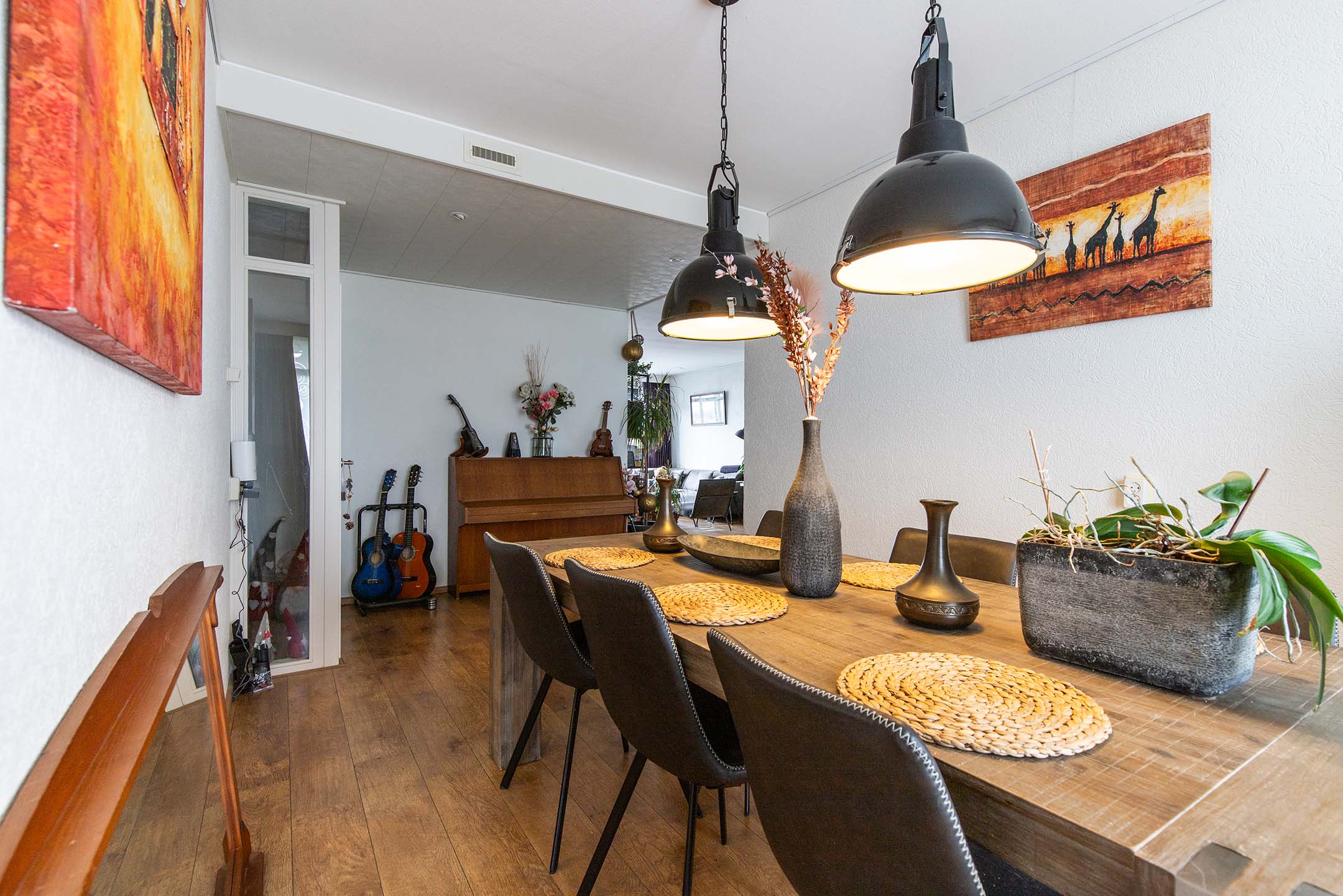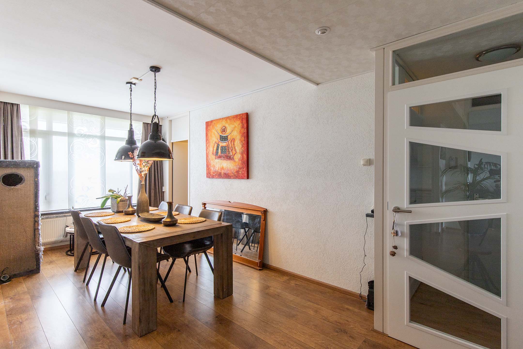 Z-vormige woonkamer met een eet- en zitgedeelte. De wanden zijn ook hier afgewerkt met granol en het plafond met spuitwerk. Een deel van het plafond is verlaagd en is voorzien van ingebouwde spotjes. Vanuit de woonkamer loop je door naar het balkon.