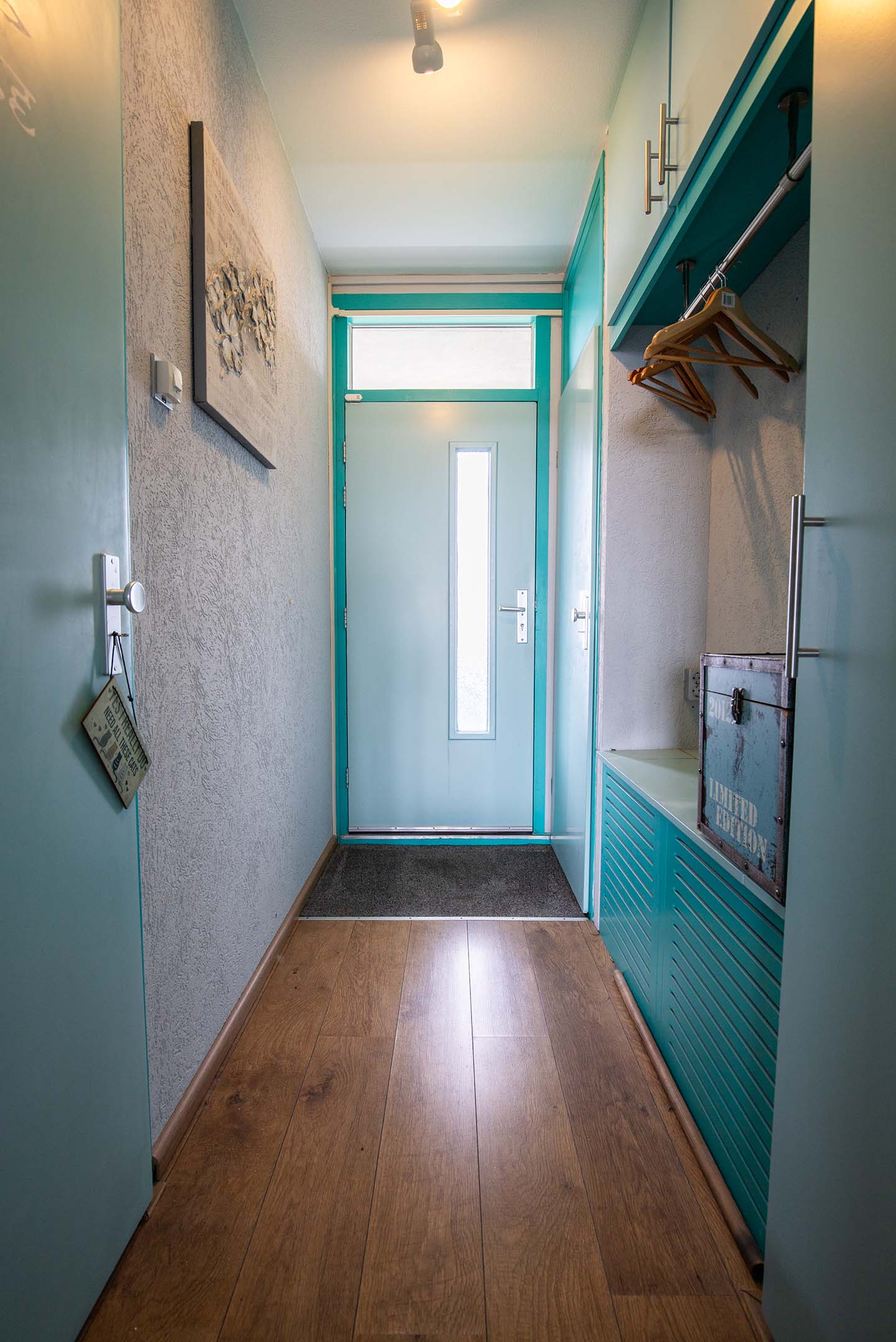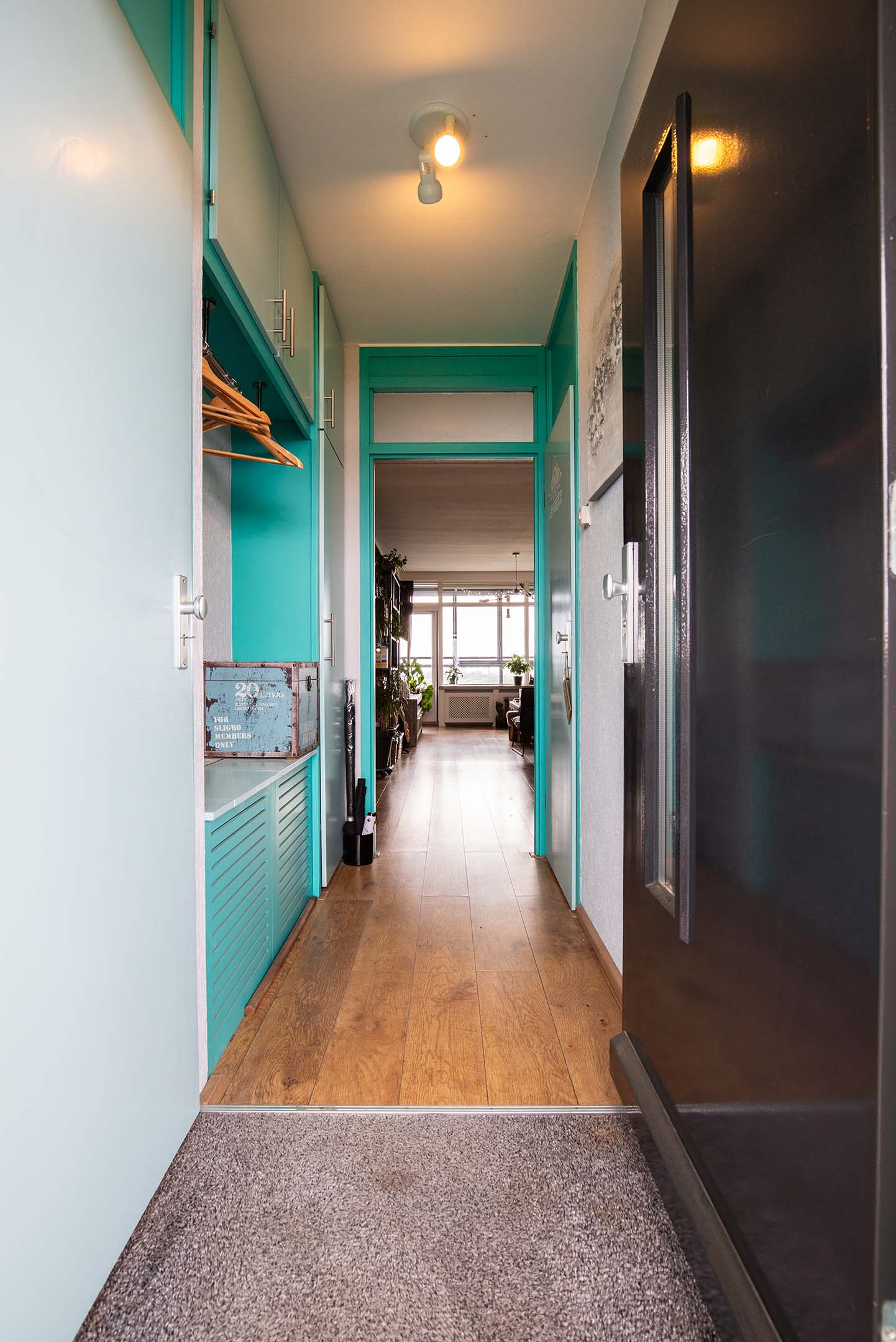 Entree/hal appartement: met meterkast (6 groepen met 2 aardlekschakelaars) en diverse bergkasten. De wanden zijn afgewerkt met granol en het plafond is voorzien van spuitwerk.