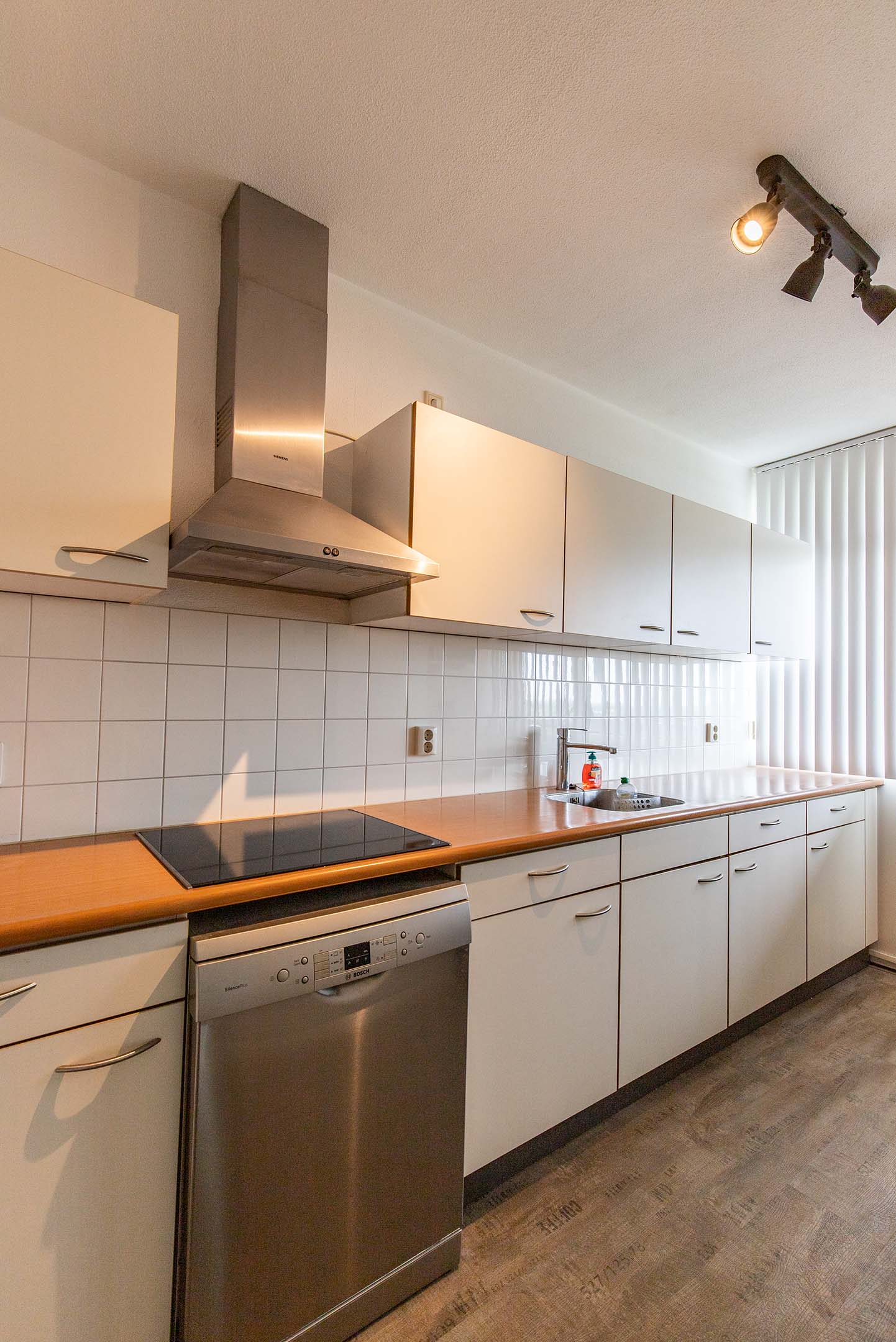 De keuken is voorzien van een lichtkleurige inrichting bestaande uit: