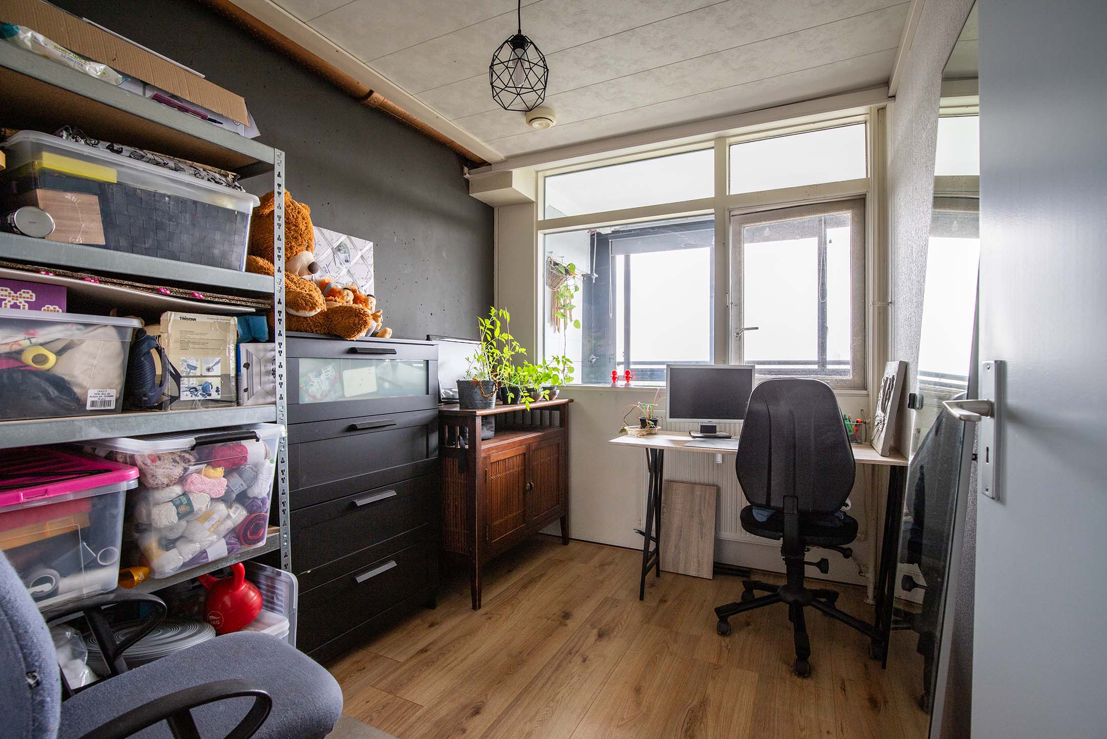 Vanuit de woonkamer is ook 1 van de slaapkamers bereikbaar. Middels een gang zijn achtereenvolgende de badkamer, het toilet, de berging en de 2 overige slaapkamers bereikbaar.