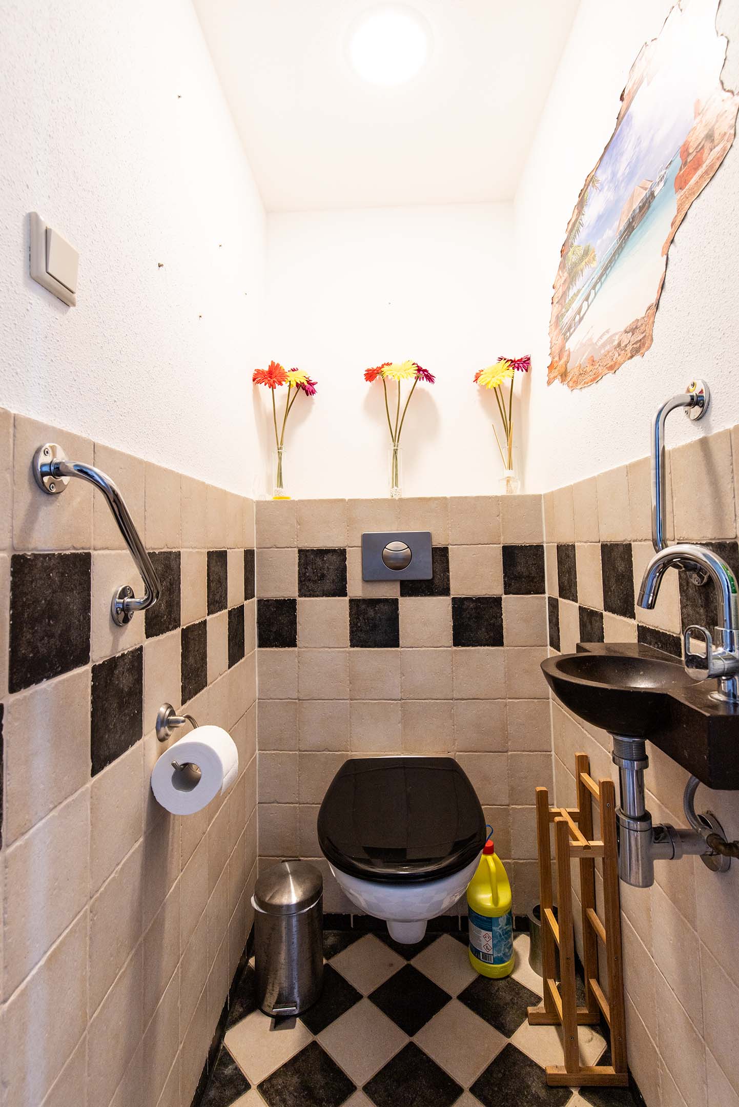 Het toilet, met fonteintje, is voorzien van een vrijhangend closet met ingebouwd spoelreservoir. De vloer is betegeld; de wanden zijn deels betegeld waarboven spuitwerk is aangebracht en het plafond is eveneens afgewerkt met spuitwerk.