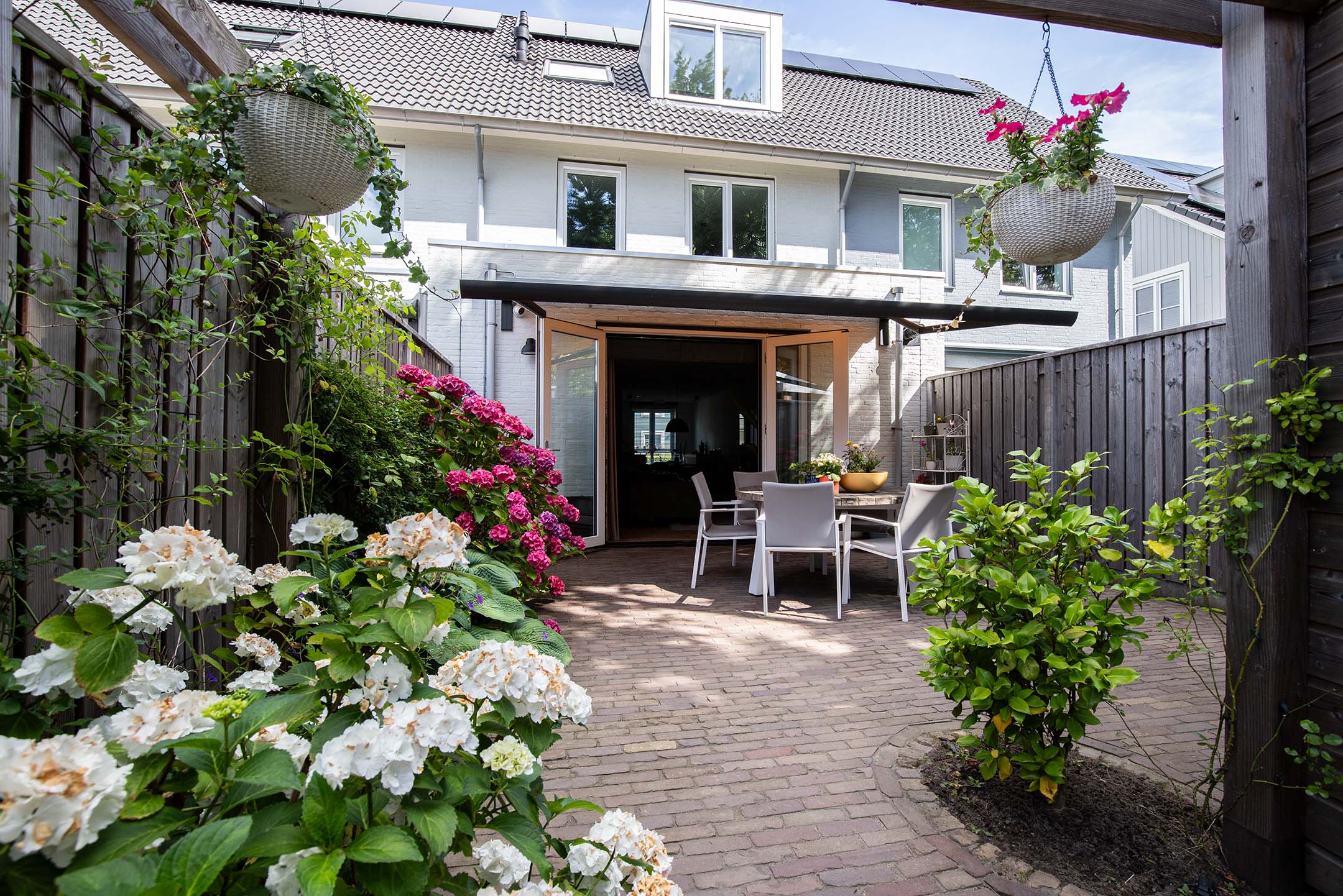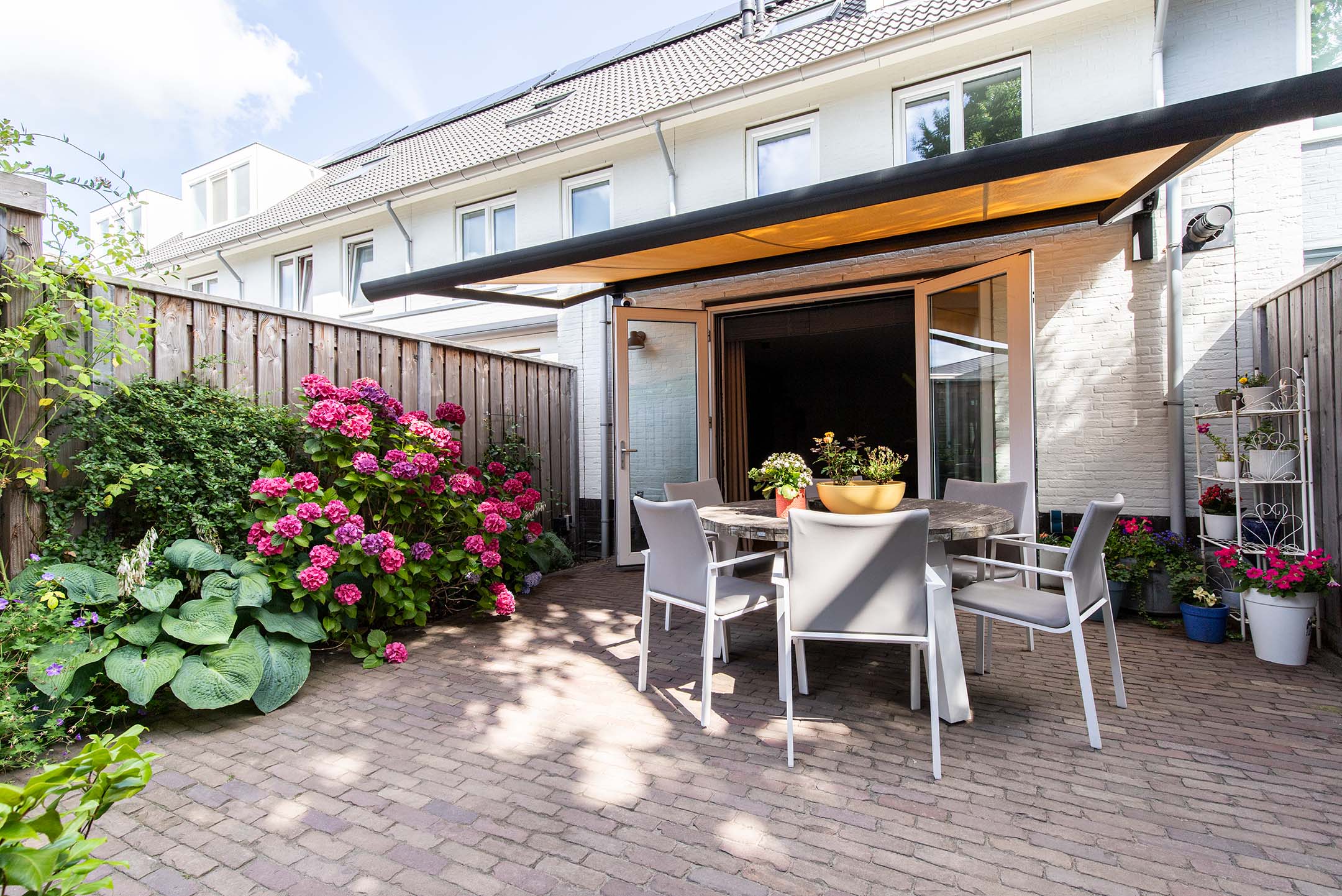 De achtertuin is grotendeels verhard met gebakken klinkers en aan de zijkanten voorzien van beplante borders. De berging is opgetrokken uit houten delen. Achterin de tuin is de extra brede poort gesitueerd welke uitkomt op de brandgang. Een over de volle breedte van het huis geplaatste, elektrisch bedienbare luifel biedt volop schaduw om lekker te zitten en vooral te genieten van de stille en groene omgeving.