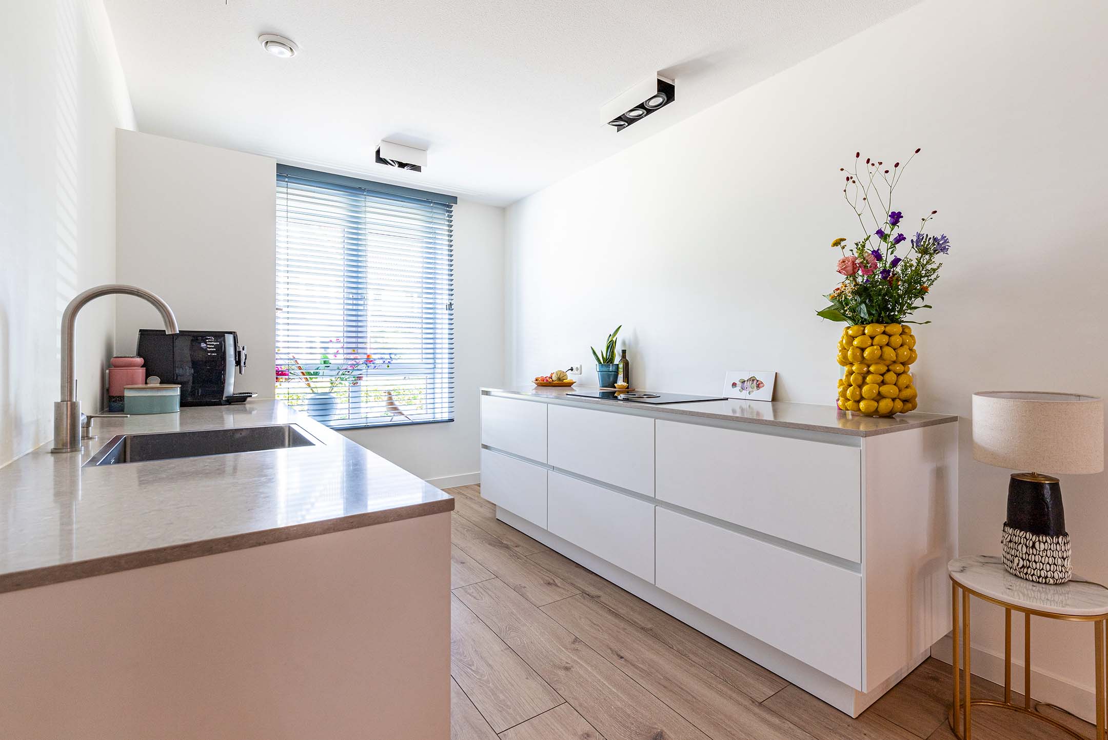 De gehele beganegrondvloer is afgewerkt met tegels in houtlook waaronder vloerverwarming.