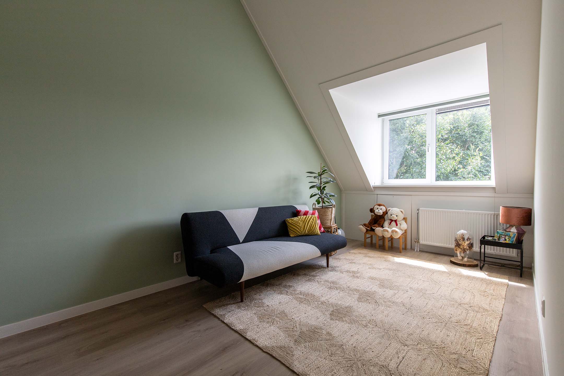 De riante zolderkamer, aan de achterzijde voorzien van een dakkapel, zou met gemak gesplitst kunnen worden zodat hier bijvoorbeeld 2 extra slaapkamers of aparte werkruimtes ontstaan. Deze ruimte is voor diverse doeleinden geschikt.