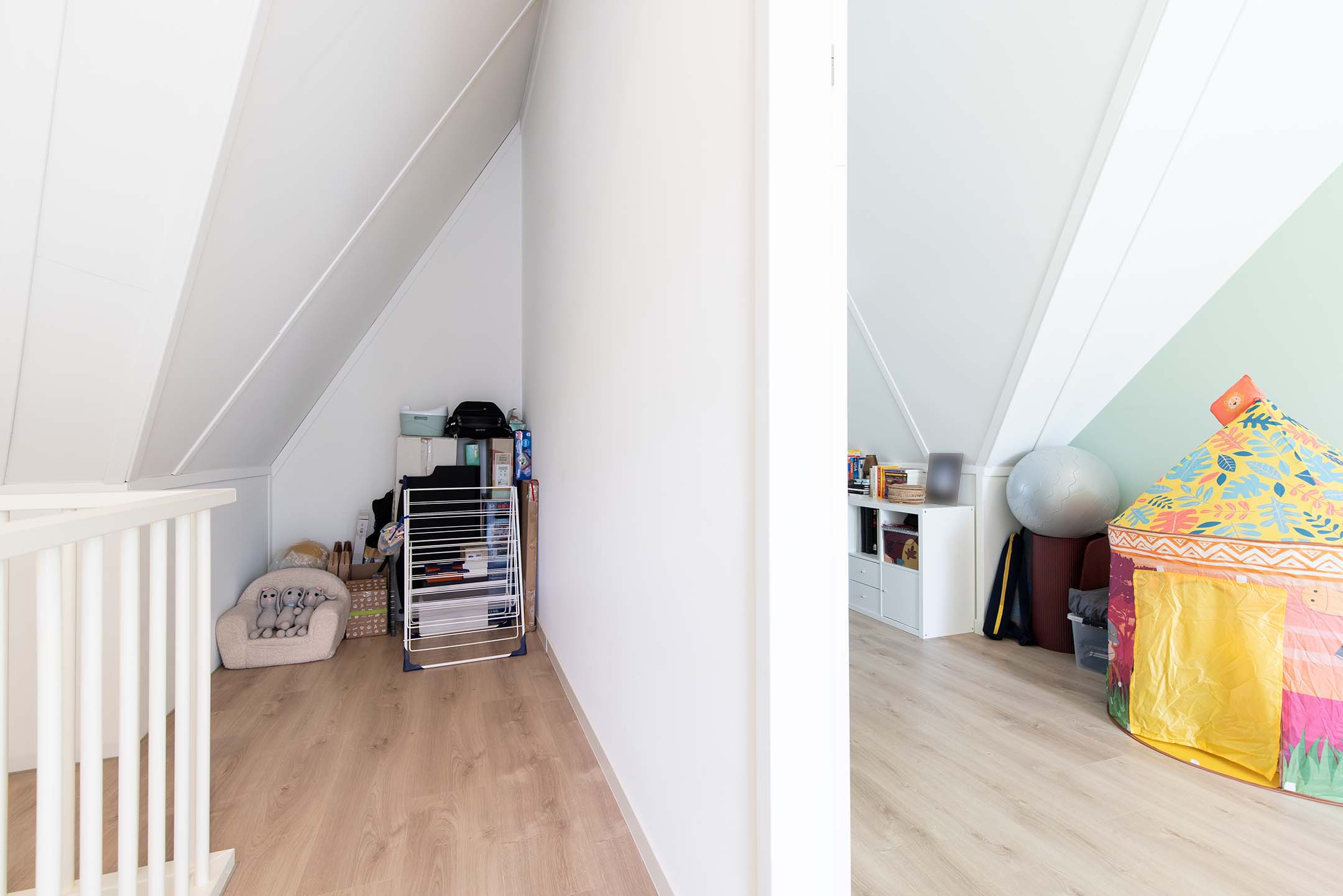 Middels de vaste trapopgang kom je op de tweede verdieping waar de overloop toegang biedt tot de aparte wasruimte (met de opstelling van de HR c.v.-combiketel en de unit van de mechanische ventilatie). Deze ruimte heeft veel daglicht-inval door het grote Velux dakvenster.
